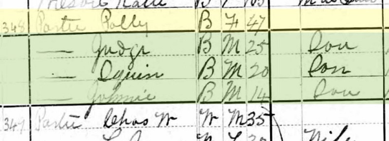 The 1880 U.S. Federal Census, Panola County, Mississippi: Polly Partee, head of household, with her three sons in the house, Judge (25), Square (20), and Johnnie (14). Grandma Sarah was married with kids in her house nearby, in Tate County. (Source: Census Place: Pleasant Mount, Panola, Mississippi; Roll: 661; Page: 65C; Enumeration District: 153, Ancestry.com)