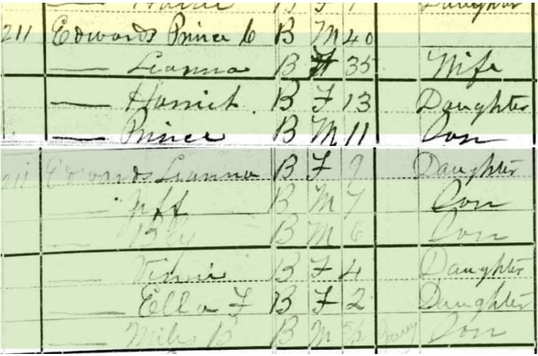 As mentioned earlier, my great great grandmother Polly Partee had at least four known children: Grandma Sarah (1852-1923), Judge Partee (1854-1915), Square Partee Sr. (1858-1910), and Johnny Partee (1865-192?). A man named Dock Partee, born about 1850, may have also been her son. They all had been enslaved by Squire Boone Partee in Panola County, and Grandma Polly was the head cook on his plantation, according to oral history. Major clues from oral history, autosomal DNA matches, and 67-marker Y-DNA testing have collectively confirmed that a man named Prince Edwards was Grandma Sarah and Uncle Square Partee’s father. Prince, as well as his parents and siblings, had been enslaved by William Edwards Sr. and later William Jr. nearby. Now I no longer have to wonder if Grandpa Prince was also Uncle Johnny’s father. DNA is indicating that he was.