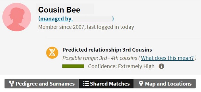 Recently, a new DNA match, “Cousin Bee,“ appeared in AncestryDNA. She shares 184 cM over 12 segments with my mother. That amount of DNA raised eyebrows. This is someone who I should be able to identify how we are related, if there’s a family tree for public viewing. That amount is in the 2nd to 3rd cousin range, a non-distant relative. When I clicked “Shared Matches,” I got a long list of known family members who are related on Grandma Sarah’s side. Those matches are predicted fourth cousins or closer to Cousin Bee, based on DNA-sharing amounts.
