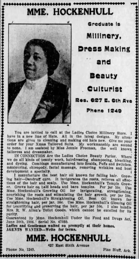 Like the legendary Madam C. J. Walker and Annie Malone, she also manufactured her own hair products. Her 11 December 1912 newspaper ad states, “I manufacture the best hair oil known for falling hair. Growing hair – dandruff cure. It invigorates the roots, relieves all affections of the hair and scalp. Use Mme. Hockenhull’s Temple Grower. Grows hair on bald heads and bare temples ….. Guaranteed by Mme. Hockenhull under the Foods and Drugs Act, June 30th, 1906, Serial No. 47080.” (ad below) Her fashion in millinery (hat-making), dress-making, and her hair products captured Booker T. Washington’s attention, and thus he invited her to present at the 1914 NNBL Convention.