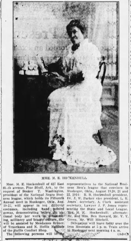 I recently discovered that the following year, Booker T. Washington requested that my mother’s maternal grandmother’s sister, Madam Mattie Ella Danner Hockenhull, present her work at the 1914 NNBL Convention, held in Muskogee, Oklahoma. On 18 August 1914, the Pine Bluff Daily Graphic newspaper (Pine Bluff, Arkansas) wrote, “Mme M. E. Hockenhull of 627 E. Sixth Avenue, Pine Bluff, Arkansas, by the request of Booker T. Washington, president of the National Negro Business League, which holds its Fifteenth Annual meet in Muskogee, Okla., Aug. 19-22, will appear in ten different costumes, including hand-printed gowns, demonstrating before the national body her work in dressmaking, millinery and beauty culture.” (article below)