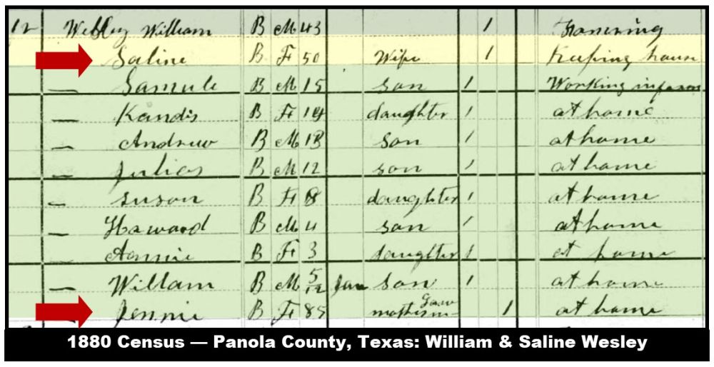 Per the 1870 and 1880 censuses, William Wesley was born in Tennessee. Someone told the 1880 census-taker that Saline was born in Mississippi and that both of her parents were born in North Carolina. Not only that, the mother-in-law, Jennie, was in their household in 1880. Her reported age was 85, and her reported birthplace was North Carolina. Although this suggests that Jennie was the mother of Saline, what if the informant was Saline, and she told the census-taker that Jennie was her mother-in-law? Hmmmm….. See image below.
