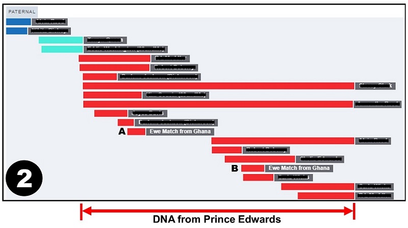 Fascinatingly, two African DNA cousins from the Ewe people of the Volta region of southeast Ghana also match my mother in this red section of her paternal chromosome 2. Ewe Cousin A had taken the 23andMe DNA test some years ago, and Ewe Cousin B recently took the AncestryDNA test, and his raw data file was uploaded into GEDmatch. So, I had informative chromosome segment data for both. To add, I know that these African cousins are my mother’s paternal cousins because they also match two of my mother’s paternal first cousins in this area. In fact, the two longest bars on the diagram above are my mother’s paternal first cousins.
