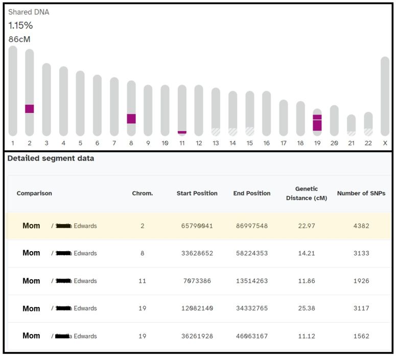 Example: Chromosome segment data (23andMe) between my mother and her third cousin, a descendant of Uncle Peter Edwards, with whom she shares a total of 86 cM, including a 22.97 cM segment on Chromosome 2.