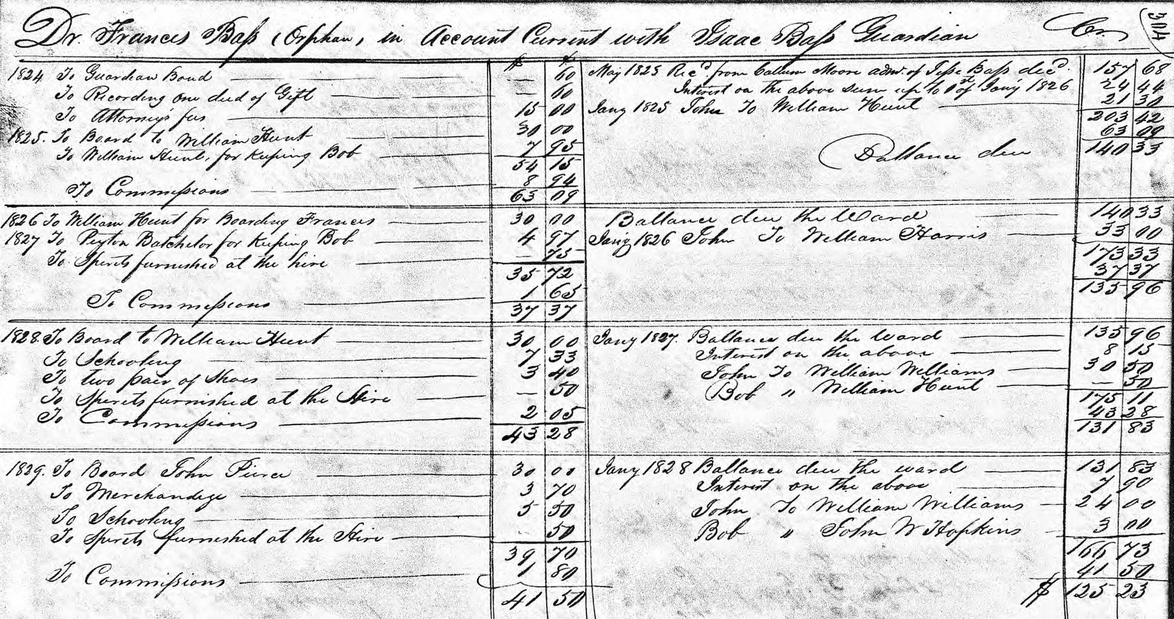 The following record below shows that William Hunt was paid for “keeping” Bob and John, from 1824 to 1827. Shortly after Jesse Bass died in 1822, his widow Frances remarried to William Hunt in September 1823. Big Bob and John’s mother, Annie, had been bequeathed back to widow Frances, who had inherited her in 1810 from her father, Benjamin Pearce of Halifax County, North Carolina. Therefore, Big Bob and John were still with their mother Annie for several more years after Jesse’s demise.