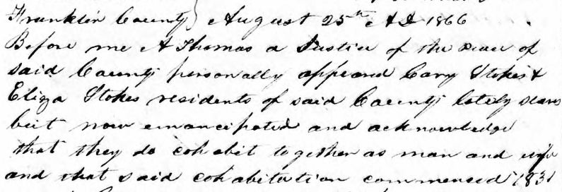 However, this 1866 North Carolina cohabitation record below shows that Cary Stokes and a woman named Eliza Stokes had been husband and wife since 1831.