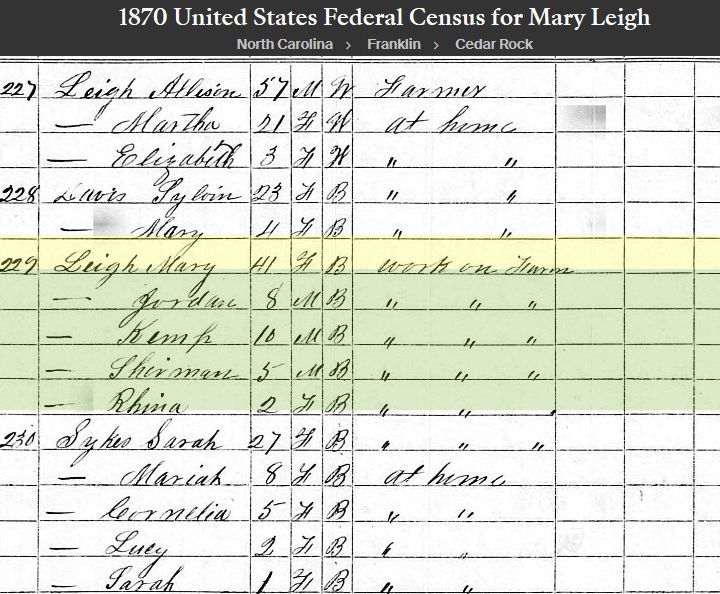 After William Stokes’s death, his daughter Nancy, who married Allison Leigh, inherited Mary and her children. In the 1870 census, Mary lived next door to widower Allison Leigh, and she and most of her children also took the Leigh surname, which was eventually spelled as “Lee.” Her daughter, Sarah Sykes, and her children also lived next door.