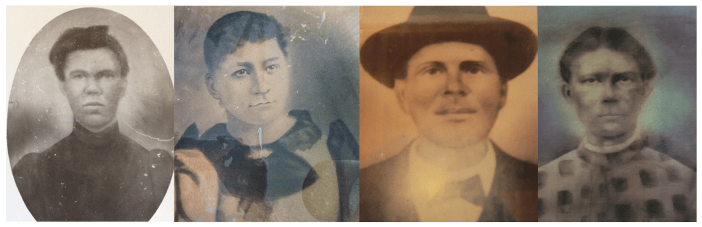 Children of Melford Atkins: L-to-R, Mattie Kennedy Ealy, Leona Kennedy Pullen, Albert Kennedy, and Adaline Kennedy Ealy