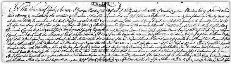 In George Reid’s will, dated 23 November 1786, he named Monmouth and Phyllis as a married couple, as well as ten other enslaved people including Senna. I’ve had a copy of his will since the mid-1990s. I can now plausibly assert with high certainty that they are my ancestors and most of the other named enslaved people were likely their children. Four important excerpts from George’s will were the following: