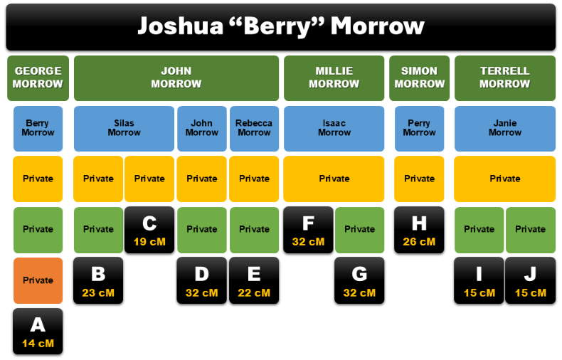 Nonetheless, some of these genetic Morrow cousins also share DNA with my mother’s second cousin (Bill Reed’s great niece), therefore, the connection pointed to Bill. I have proposed that the ten genetic Morrow cousins below are my mother’s fourth cousins once removed (C, F, H), fourth cousins twice removed (B, D, E, G, I, J), and a fourth cousin three times removed (A). Working with these genetic fourth cousins was indeed an incredible feat, as fourth cousins once to three times removed have a 10 – 30% chance of being a DNA match. Uncovering this Morrow genetic group yielded a significant genealogical payoff.