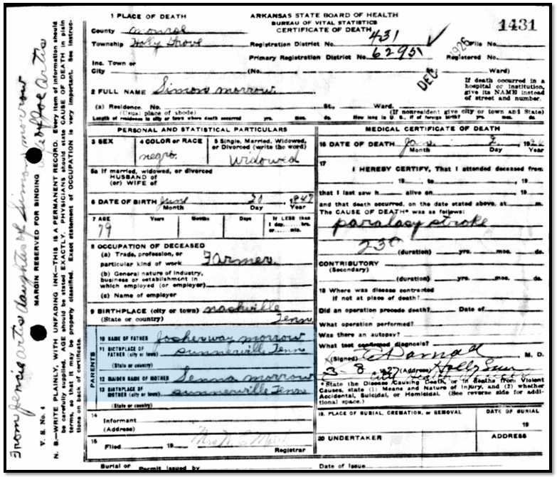 Joshua’s son, Simon Morrow, moved to Monroe County, Arkansas around 1881. He died there in 1926, and his death certificate below includes his parents’ names, “Josherway” Morrow and Senna Morrow. As noted on the side, the informant was his daughter, Jencie. The name “Senna” quickly captured my interest, so I dug a little further. The name could not be coincidental!