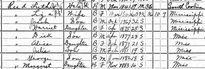 I first wrote about Alfred in a 2021 blog post titled Did He Take His Wife’s Enslaver’s Surname? Research revealed that Alfred eventually settled near Utica in Hinds County, Mississippi before 1870. While still in South Carolina, he had married Flora, an enslaved woman owned by Samuel Reid’s neighbor, James T. Liddell. Alfred and Flora had at least eight children; one of them was named Hannah Liddell Sanford. After emancipation, the family and others migrated to Hinds County. Born around 1805, Alfred appeared in the 1870 census as “Alfred Read” and in the 1880 census as “Alfred Liddell.”