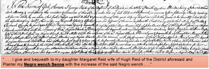 For some time, I also speculated that “old woman Scene” (also called Senna) listed in Samuel Reid’s estate might have been Bill’s maternal grandmother. She was valued at only one dollar in the estate inventory. Samuel Reid had inherited Senna, along with most of his father Hugh Reid’s enslaved people, in 1829.[3] Earlier records show that Hugh and Margaret Reid inherited Senna in 1789 from Margaret’s father, George Reid, according to his 1786 will.[4] Senna was likely about nine years old in 1786, as she was recorded as being about eighty years old in Samuel Reid’s 1857 estate, placing her birth around 1777.