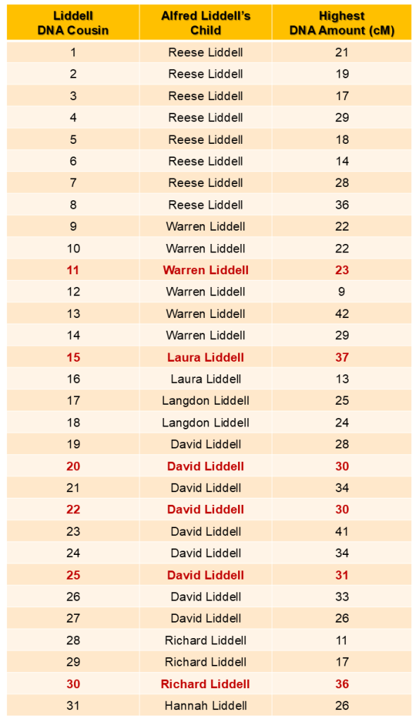 As of March 2026, at least thirty-one descendants of Alfred Reid Liddell share DNA with my mother, two of her siblings, or their first cousin—all grandchildren of Bill Reed. Some of Alfred’s descendants also share DNA with the granddaughter of Bill’s sister Louvenia. They represent five DNA-tested great-grandchildren of Bill’s proposed mother Leah—who may have been Alfred’s sister or maternal half-sister. The chart below illustrates the highest amount of DNA shared between them and Alfred’s descendants. Six of them, highlighted in red, are Alfred’s great-grandchildren and therefore closer descendants. Not every descendant matches all five individuals, but the overall pattern is still compelling evidence.