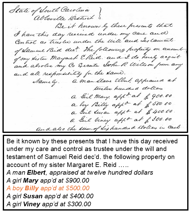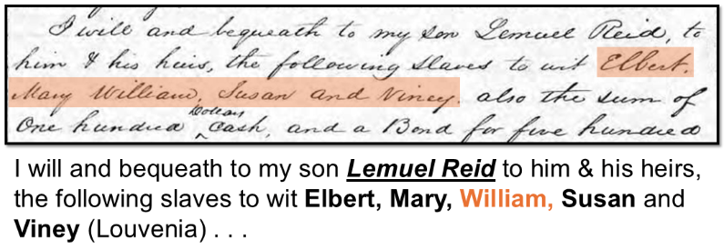Further research confirmed that Lemuel Reid inherited Bill and his siblings—Elbert, Mary, Susan, and Louvenia—from his father Samuel Reid in 1857. Although the enslaved individuals were placed in trust for Lemuel’s sister Margaret Reid, Samuel’s will allowed them to remain in Lemuel’s possession until the end of slavery in 1865. See below. Bill and his siblings were among the nineteen enslaved people inventoried in Samuel Reid’s estate.[1]
