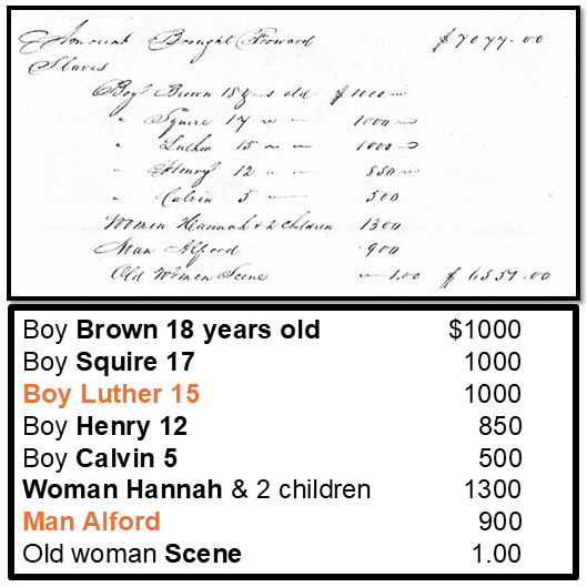 I also speculated that Bill’s mother—possibly Leah—along with Alfred and Hannah, who appeared in both Hugh Reid’s 1829 estate and Samuel Reid’s 1857 estate, may have been Senna’s children. Interestingly, Hannah and her sons, along with Alfred and “old woman Scene,” were inventoried together as a separate group of enslaved individuals in Samuel Reid’s estate, possibly indicating a family group. See below. Among Hannah’s sons was one named Luther, aged fifteen in 1857. Ultimately, the descendants of Alfred and Luther provided DNA evidence that moved this theory from speculation toward confirmation.